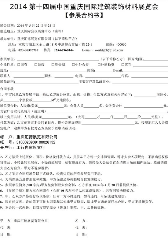 1、參展單位請詳細(xì)填寫《參展合約書》并加蓋公章,傳真或復(fù)印后寄至大會組織辦公室,并于申請之日起5天內(nèi)向大會指定銀行匯出參展費用(凡未在規(guī)定期限內(nèi)辦理付款手續(xù)的展位一律不予保留)。大會組織辦公室在收到參展費用后將向參展單位寄送或傳真《展位確認(rèn)書》,并按款到先后順序安排展位(截止日期:2014年4月20日)。