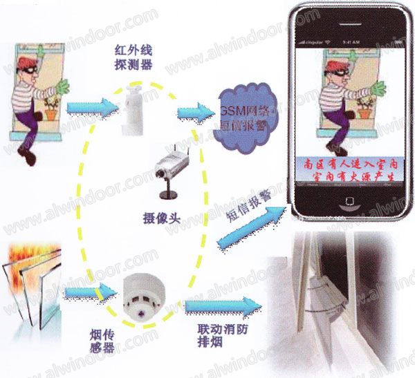系統通過手機或平板電腦通過無線網絡查看幕墻環境中的狀況,當幕墻中的玻璃破碎、門或窗被強行打開,系統會發出防盜報警短信到遠程手機或平板電腦上,遠方的用戶在接到報警信息后,可通過手機或平板電腦通過網絡攝像頭査看系統中具體引發報警的原因,并作相應的處理(如圖2.7A)。
