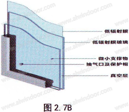 真空玻璃是將兩片平板玻璃四周密閉起來,將其間隙抽成真空并密封排氣孔,兩片玻璃之間的間隙為0.1-0.2mm,真空玻璃的兩片一般至少有一片是低輻射玻璃,這樣就將通過真空玻璃的傳導、對流和輻射方式散失的熱降到最低,其工作原理與玻璃保溫瓶的保溫隔熱原理相同,如圖2.7B所示。同時,真空玻璃由于真空層的特殊結構,因而具有良好的隔聲性能,隔聲性能指標明顯優于中空玻璃。