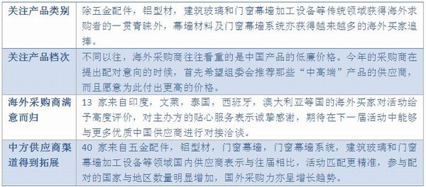 2013 中外貿易對接會還未啟動之時,就已經接到眾多海外采購商關于中國門窗幕墻供應商的咨詢郵件,有了這些基礎,2013 的貿易對接會更加“精準”。而且很明顯,采購商的實力較以往更強,更加傾向中高端產品。最終,13家海外買家和40家國內供應商進行了成功對接,活動同時獲得雙方一致好評。