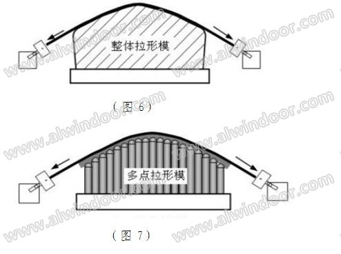 目前市場上常見的雙曲面金屬板大多采用此方式成形。胎膜拉伸成形又分為兩種方式,一種為固定的整體拉形胎膜(如圖6),另一種為可變多點拉形胎膜(如圖7)。