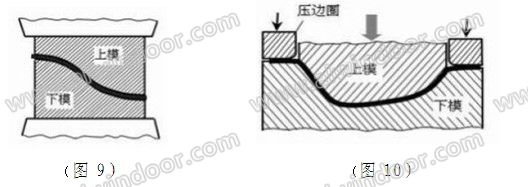 金屬模一次性沖壓成形。這是傳統的金屬板材成形方式。特別適用于日常生活中常見的金屬品小件。廣泛應用于各五金模具廠家。金屬模具一般分固定模(下模)和活動模(上模),參見圖9、圖10。根據成形板材的最終成形面的性質,預先制作出金屬上模和下模,一般下模固定,把需要成形的板材放入固定模,上模(活動模)通過液壓驅動,快速沖壓板材,從而一次性把板材沖壓出所需要的形狀。