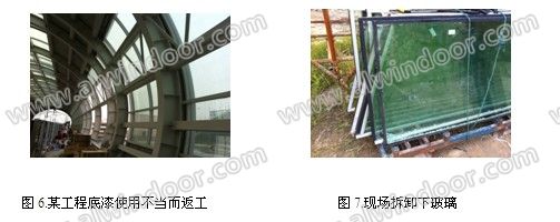 按照規范要求,底漆應按以下程序使用:a.通過相容性及粘結性試驗,確定是否使用底漆; b.底漆應在基材清洗之后結構膠施工之前使用;c. 用自然硬毛刷或干凈無絨毛的白布在被粘表面涂上一層薄而均勻的底漆;d.底漆應在完全干涸后(多介于15~30分鐘)才能施用硅酮結構膠,否則會使結構膠粘結能力下降。部分企業不按相容性試驗結果按需使用底漆,而是錯誤的將所有型材均涂刷一層底漆。根據我公司多年從事相容性試驗的經驗,部分型材無底漆時粘結良好,涂刷底漆后反而引起粘結不良,這樣也會埋下玻璃板塊脫落的種子。圖6、圖7為某工程因底漆未完全干涸時施打硅酮結構膠,未做割膠試驗,裝配到工程上一周,發現粘結在附框處硅酮結構膠部分脫粘,最后玻璃板塊全部卸下重新返工。