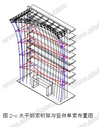 牽引豎向索通過各相應得水平索上的連接點并初步固定。同步施加各豎向索的預應力達到設計值的20%。調節各連接點的定位位置。觀測個水平索內力的變化。