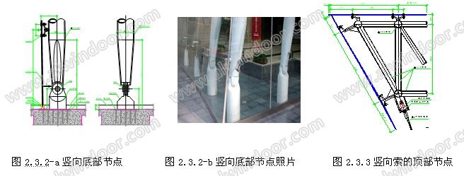 2.3.3、豎向索的頂部節點比較復雜,由于受力變形的要求鋼索與鋼桁架的連接節點必須能夠在鋼索受水平荷載變位時自由轉動,同時又要能吸收索材料的軸向長度誤差和安裝誤差。我們在此處安裝了球形腳