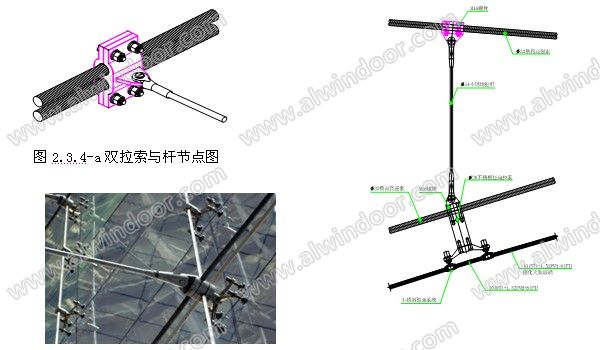 2.3.4、由于水平索桁架的鋼索內力極大,在設計時采用了雙索同時受力的方案。為了解決雙拉索與桿的在工作狀態時能牢固連接又能相對位移,設計了特殊節點(如圖2.3.4-a、b、c)。