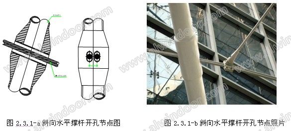 壓桿件,將幕墻的大部分水平荷載傳遞給主體結構,但由于撐桿的軸心線與索桁架的受力索及聯系桿的軸心線在一個平面上,必然有相交的問題,我們采取了在撐桿與索桿相交處開孔和局部加強的辦法解決了這一夠造上的難題。(如圖2.3.1-a、b)