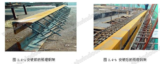 埋件的受力提出了很高的要求。我們根據嚴格的計算和現場的實際情況,在每一榀水平索桁架連接的樓板處設置了整體預埋鋼架,確保幕墻在受最大荷載時的安全度。(如圖2.4-a、b)