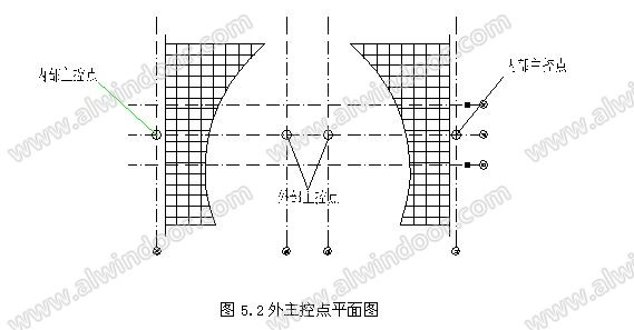 為測量準確、方便、直觀,采用內控法。設定11軸、20軸與P軸的交點為東、西樓的內主控點,15軸17軸與P軸的交點為外主控點,在主控點位置上設置主控點標志。(如圖5.2)