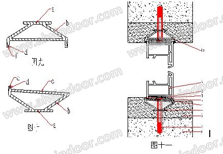 圖九和圖十所示是新開(kāi)發(fā)的用于整窗單元安裝玻璃纖維增強(qiáng)塑料附框,圖九為窗的下部和兩側(cè)所用附框,圖十是窗的上部所用的附框。圖十一是整窗單元安裝的節(jié)點(diǎn)圖,先將特殊構(gòu)造的附框4和10組成的整體附框,用金屬膨脹螺栓2固定在建筑預(yù)留的洞口1上,再由建筑進(jìn)行防水水泥砂漿二次收口裝飾面的濕作業(yè)3,待濕作業(yè)完成后先安裝彈簧卡片5后進(jìn)行整窗單元安裝,先將窗9的上端斜推入附框10的槽口內(nèi)再將下部推入附框4內(nèi),同時(shí)卡簧卡住窗框9的內(nèi)壁,實(shí)現(xiàn)有效的連接,在鋁合金窗框9與特殊構(gòu)造的附框4之間填充保溫材料8,內(nèi)外鋁合金窗框9與室外防水水泥砂漿和室內(nèi)裝飾面用室外密封膠7和室內(nèi)密封膠6進(jìn)行密封,最終實(shí)現(xiàn)門(mén)窗框的整窗單元安裝。