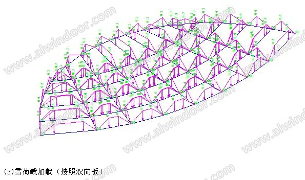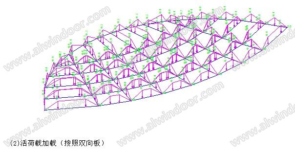 5 計算參數 (1)恒荷載(主要為玻璃和駁接爪件):0.65KN/m2 (2)活荷載:0.5 KN/m2 (3)雪荷載:0.4 KN/m2 (4)風荷載:,基本風壓0.55 KN/m2,分兩種情況考慮 ① 第一種情況:按照荷載規范GB50009-2012中8.3.3條中的第二條中的要求,體形系數取-2,此為負風壓; 按照外圍護結構計算公式得WK= βgzμslμzw0=-1.5 KN/m2 ② 第一種情況:為安全考慮,體型系數取0.5,此為正風壓; 按照外圍護結構計算公式得WK= βgzμslμzw0=0.4 KN/m2 (5)地震參數:8度抗震(0.2g),設計地震分組為第一組,場地類別為Ⅱ類,場地特征周期Tg=0.40 (6)溫度:溫差按照±30°考慮 6 結構計算 6.1計算模型
