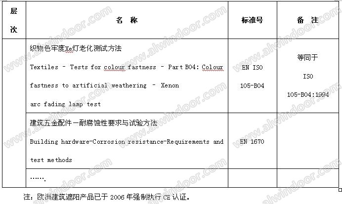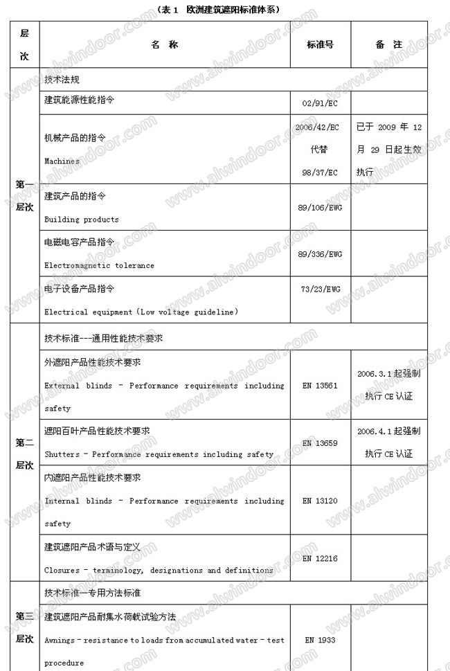 1 概述 目前,我國在《公共建筑節能設計標準》、《夏熱冬暖地區居住建筑節能設計標準》、《夏熱冬冷地區居住節能設計標準》、《民用建筑熱工設計規范》、《采暖通風與空調調節設計規范》等標準規范中對建筑遮陽已有明確的規定和要求。 但由于原材料使用不當、加工工藝不合理、出廠檢驗控制不嚴等因素造成產品缺陷問題的存在,遮陽產品壽命短、易破壞、噪音大等現象時有發生,在一定程度上已經影響到建筑遮陽的推廣應用,成為制約產業發展的重要瓶頸。 因此,積極推出通過質量認證的建筑遮陽產品已勢在必行。 2 國外(歐盟、美國及日本)建筑產品的認證認可制度國外發達國家經過多年的發展建立起了一套完善的建筑產品監督管理體系、法規標準體系和認證體系。最具代表性的包括: 。1)聯盟委員會(CEN)建立的以《建筑產品指令》CPD89/06/EEC為總綱的建筑產品認證體系,確立涉及6項基本要求的建筑產品必須實施的強制認證,認證的統一標識為CE Mark。著名的認證機構包括BUQI、TUV、CSTB。其它歐洲認證還有BS、SGS等。 。2)美國的建筑產品認證以民間機構的認證為主,屬于自愿性認證,包括建筑部品認證和產品認證。部品認證由原來的四家機構整合為全國統一的建筑部品認定的評估機構——國際法規委員會評估公司(ICC-ES)。產品認證由各建筑專業協會進行。影響評定的還包括環境標志認證和節能認證(能源之星)。著名的認證機構如UL。 。3)日本以《建筑基準法》為根本要求開展JIS認證和住宅部品(BL)認證。 3 歐盟建筑遮陽產品認證 歐洲的遮陽技術標準體系可能是最完善的,有完整的技術法規和標準體系。其中最高層次的是4個技術法規,包括02/9l/EC建筑能源性能指令、98/37/EG機械產品的指令、89/106/EWG建筑產品的指令、89/336/EWG電磁電容產品指令和73/23/EWG電子設備產品指令。第二層次是產品通用性能標準,即為內、外遮陽和百葉遮陽產品通用性能技術要求。第三層次為專用方法標準,涉及機械安全、光學、熱學、防盜、隔聲等近30多個標準。第四個層次為其他標準,主要指遮陽產品涉及的金屬材料和電機等材料標準。