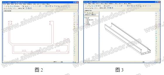 幕墻構(gòu)配件大多為開模型材,適合采用“拉伸”建模方法。Pro/E與AutoCAD有很好的接口設(shè)計,如果在AutoCAD中已經(jīng)繪制好型材截面,可以將截面文件保存為DWG或者DXF文件,然后在Pro/E中直接打開截面文件,通過“拉伸”操作得到三維模型(圖2,圖3),非常方便。但需注意的是,由于這種方法沒有調(diào)用Pro/E的標(biāo)準(zhǔn)模板文件,因此工作空間里沒有預(yù)先建立三個標(biāo)準(zhǔn)的參考平面,需要自己建立一個草繪平面和一個參考平面。草繪平面可選擇型材截面所在平面,參考平面與草繪平面正交。圖3為鋁型材的線框模型。