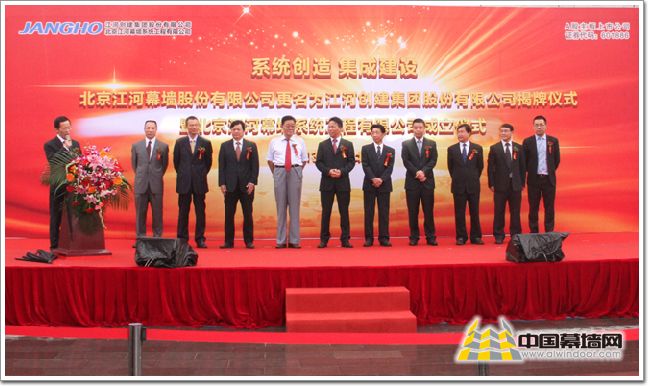 【中國(guó)幕墻網(wǎng)】2013年5月28日,北京江河幕墻股份有限公司正式更名為江河創(chuàng)建集團(tuán)股份有限公司(簡(jiǎn)稱“江河創(chuàng)建”)揭牌儀式暨子公司北京江河幕墻系統(tǒng)工程有限公司(簡(jiǎn)稱“江河幕墻”)設(shè)立儀式在北京隆重舉行。江河創(chuàng)建董事長(zhǎng)劉載望攜子公司江河幕墻董事長(zhǎng)兼總裁祁宏偉、北京港源建筑裝飾工程有限公司(簡(jiǎn)稱“港源裝飾”)董事長(zhǎng)王波、承達(dá)集團(tuán)有限公司(簡(jiǎn)稱“承達(dá)裝飾”)執(zhí)行董事馬振宇及集團(tuán)總部高管、員工代表參加了揭牌儀式,中國(guó)建筑金屬結(jié)構(gòu)協(xié)會(huì)會(huì)長(zhǎng)姚兵及鋁門窗幕墻委員會(huì)副主任劉萬奇、中國(guó)建筑裝飾協(xié)會(huì)名譽(yù)會(huì)長(zhǎng)馬挺貴應(yīng)邀出席儀式,儀式由江河創(chuàng)建常務(wù)副總裁許興利主持。