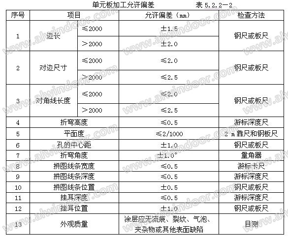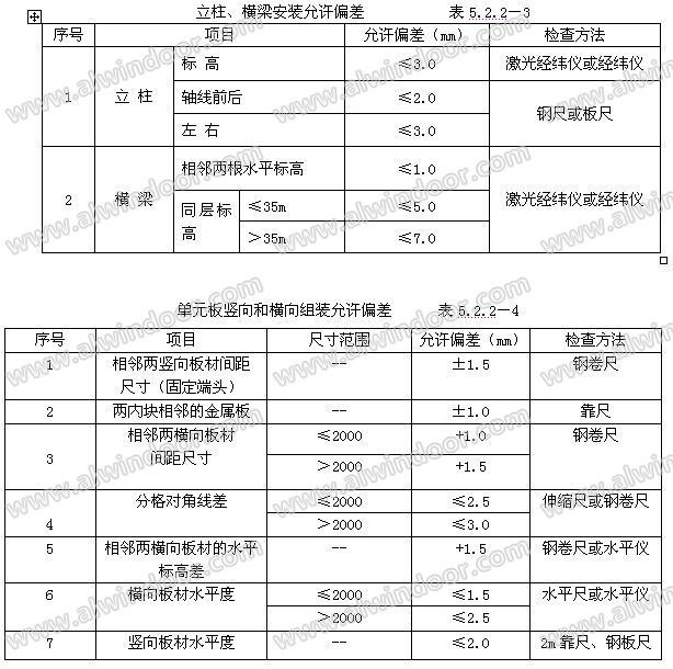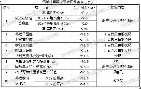 5 質量控制 5.1 執行標準 1 《建筑工程施工質量驗收統一標準》 GB 50300-2001 2 《建筑裝飾裝修工程質量驗收規范》 GB 50210-2001 3 《金屬與石材幕墻工程技術規范》 JGJ 133—2001 5.2 質量檢驗 5.2.1 鋁單板幕墻依照《建筑裝飾裝修工程質量驗收規范》GB 50210-2001進行驗收。 5.2.2 鋁單板幕墻的質量要求、允許偏差和檢驗方法見表5.2.2-1、5.2.2-2、5.2.2-3、5.2.2-4、5.2.2-5。