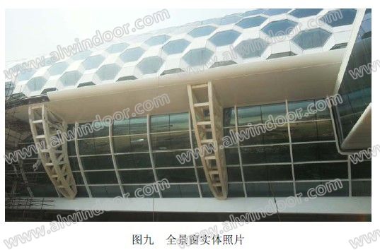 全景窗共有5個,分布在主指廊東西兩側(cè);由于全景窗處的玻璃幕墻上下呈弧形、光滑鋁板幕墻也是呈弧形的雙曲造型(見圖八),因此固定幕墻的用的鋼支撐骨架的加工尤其重要。雙曲面造型的光滑鋁板的加工和安裝對光滑鋁板處的外觀造型相當(dāng)重要。