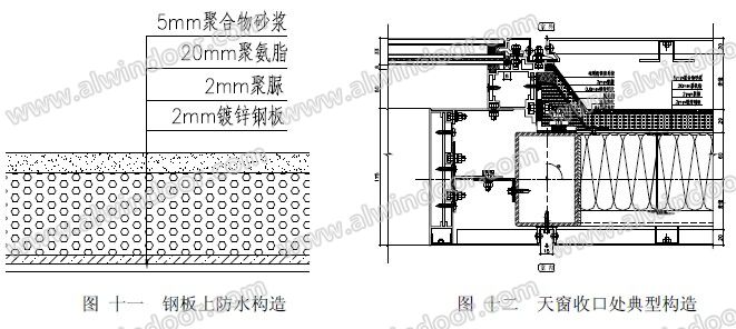 本工程屋面總面積約23萬平方米,曲面造型復(fù)雜,各種收邊收口數(shù)量大,而且地處海邊,直接面臨每年多次臺風(fēng)暴雨侵襲。因此屋面防水是工程設(shè)計和施工的重點也是難點。航站樓屋面的非天窗區(qū)域的金屬屋面采用硬泡聚氨酯與聚脲彈性涂料作為防水層。設(shè)計選用柔性防水體系,即在基層鍍鋅鋼板上噴涂2mm聚脲和20mm厚的硬泡聚氨脂連為一體,可以有效地噴涂于各種節(jié)點構(gòu)造陰角和收邊收口,最大限度的減少防水薄弱點。詳見圖十一、十二。