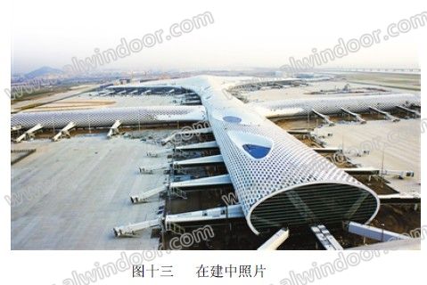 深圳機場T3航站樓屋面工程的奇異造型存在前所未有的技術(shù)復(fù)雜性,設(shè)計施工中采用了多項新技術(shù)、新材料、新工藝,為此業(yè)主邀請了全國幕墻行業(yè)以及建筑防水諸多專家進行了前后數(shù)十次技術(shù)論證,許多專家為本工程提出了寶貴建議,施工中也根據(jù)專家意見不斷完善和深化設(shè)計和施工工藝,包括蜂窩型單元鋼結(jié)構(gòu)多角度自由調(diào)整、聚脲防水材料構(gòu)造節(jié)點處理以及大面積人工操作的施工工藝等。屋面系統(tǒng)業(yè)已通過第三方的性能檢測,防水施工過程中每一道工序都做了現(xiàn)場淋水試驗,目前施工基本完成封閉。可以預(yù)料,一座反映國際水平技術(shù)的現(xiàn)代化航站樓將屹立在世人面前。(見圖十三)。