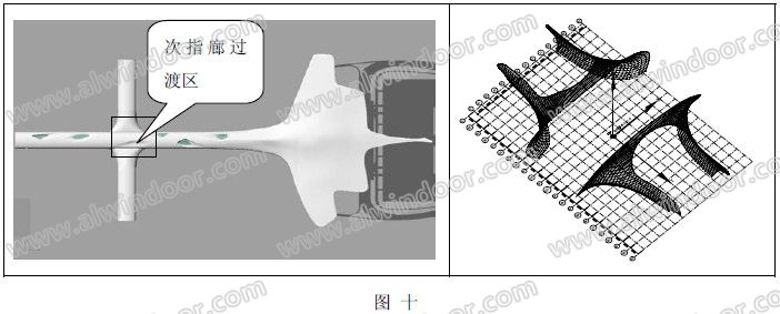 十字指廊過渡區(qū)位于主指廊與次指廊交接處,采用全鋁板幕墻形式,部分鋁板均為空間曲面鋁板(見圖十)。