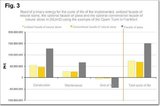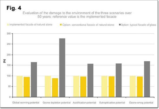 研究的第二部分對(duì)各種外墻替代設(shè)計(jì)進(jìn)行了比較,展示了天然石材相對(duì)于玻璃元件而言的顯著生態(tài)優(yōu)勢(shì),尤其是對(duì)于大約3萬平方米的整個(gè)幕墻而言。玻璃幕墻(幕墻選項(xiàng)3)的主要能源要求是同等天然石材幕墻的2倍以上(選項(xiàng)1和2,圖3)。