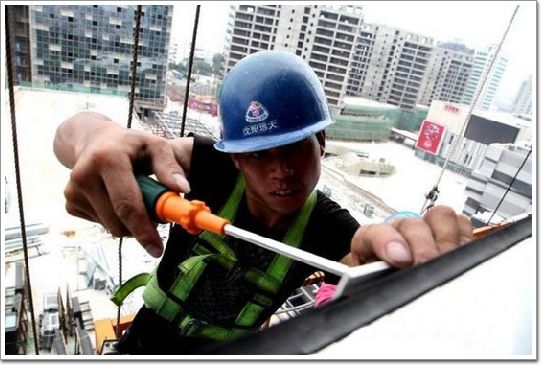 玻璃幕墻的安裝必須在吊欄上完成,每當張新強和工友劉仰兵舉起沉重的玻璃時,吊欄便會在空中搖擺,看得人膽戰心驚。不得已,他們只能用橡膠繩把吊欄緊緊地拴在窗框上。“高空作業的危險性是有的,保護措施要做好,自己也要格外小心。”劉仰兵說。每天近10小時的工作,劉仰兵和張新強能裝30多塊小的玻璃幕墻。