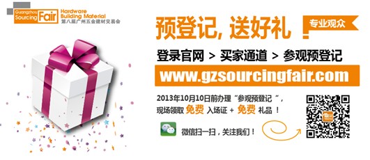 2013年秋季第八屆廣州五金建材交易會(Guangzhou Sourcing Fair)即將于10月14-17日在廣州(琶洲)保利世界貿易中心博覽館隆重舉辦!展會“以出口貿易為主導,國內外貿易相結合”,云集國內優質廠家展商,與會買家遍及全球,現場服務優質周到,展館地鐵直達交通便捷,是廣交會期間極具競爭力的五金建材專業展貿平臺!