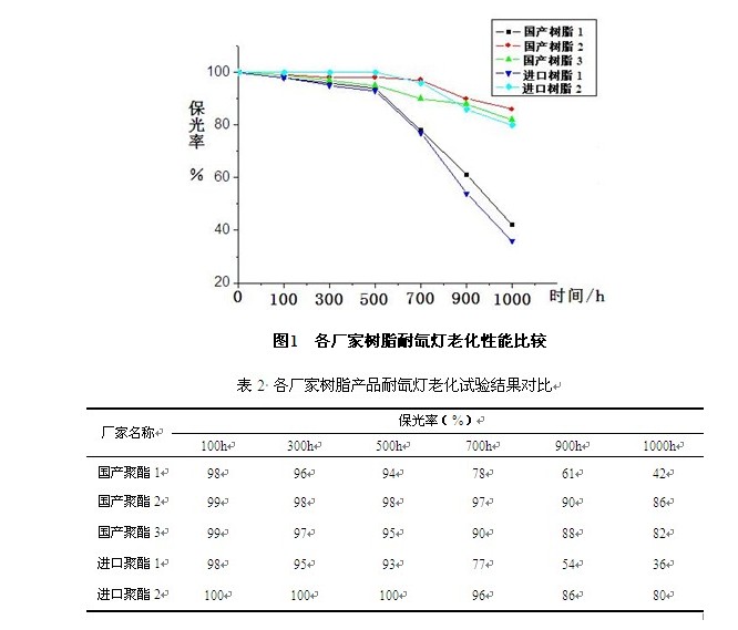 圖1 各廠家樹脂耐氙燈老化性能比較