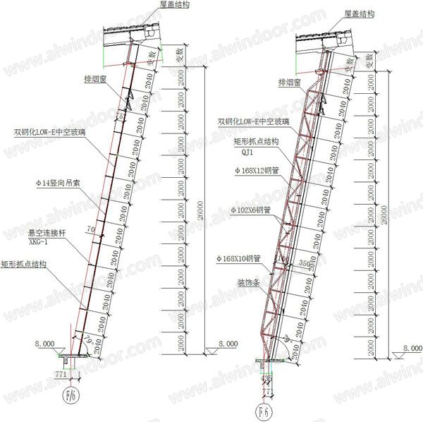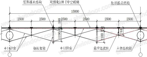 珠江散步道幕墻、內(nèi)庭幕墻、餐廳幕墻均位于北立面。其中珠江散步道幕墻長466.7m,每90m設一道伸縮縫,高28m,幕墻向外傾斜11.3度,主體結構為跨度15.0m大鋼柱結構。幕墻在15.0m內(nèi)每隔5.0m設一榀豎向桁架。水平支撐體系采用斷面小、受力性能好的正交預應力拉索結構。每單元跨度15.0m沿垂直方向按標高每2.0m布置。使東、西面與北面膠縫保恃同一水平。玻璃分格展開分格2500×2040mm。(如圖五、圖六)內(nèi)庭幕墻借助土建結構柱的的布置,南北面拉索每7.5m為一跨沿垂直方向每2.0m布置水平拉索系統(tǒng)。玻璃分格同其他面。
