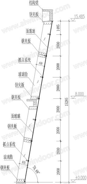 面板采用12(FT)LOW-E+12A+10(FT)雙鋼化LOW-E中空玻璃,廣州處于南方,光照時間長,為了保證能量的損失,采用遮陽性LOW-E中空玻璃,可見透射率55%,熱光性能達到Ⅳ級。玻璃肋采用12(FT)+1。52PVB+10(FT)夾膠玻璃,這樣個別肋玻的突然破裂,自身不會散落,保證安全,而且保持“整體”在幕墻上,給局部維修帶來可能。