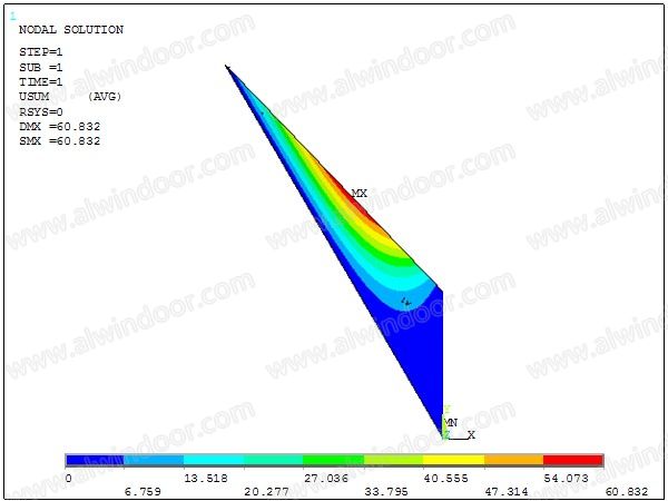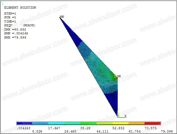 三角形玻璃采用6+1.14pvb+6+12A+8Low-e中空夾膠玻璃配置,在進行結構分析時,我們選取了最不利受力單元板塊進行分析,結果如圖9、圖10所示: