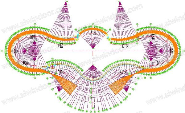 邯鄲文化藝術中心鍍銅GRC板幕墻造型由連續(xù)曲面組成(圖7),采用開縫式鱗片疊合造型,幕墻高度隨曲面的延伸高低變化、平滑過渡。幕墻按平面半徑的不同共分為11個區(qū)(圖8),包括A區(qū)、B區(qū)、C區(qū)、D區(qū)、E區(qū)、A’區(qū)、B’區(qū)、C’區(qū)、D’區(qū)、E’區(qū)、F區(qū)。