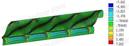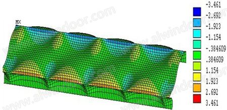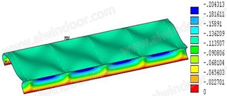 沿風向(即X方向)的最大位移為0.204313mm,也是整體模型最大變形。最大撓度的位置出現鋁板兩側面加勁肋之間的中部位置。