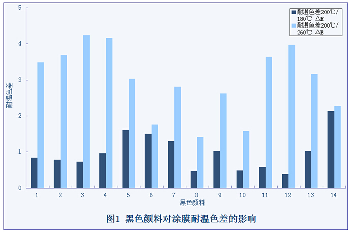 將噴涂好的鋁板分別放入180℃、200℃和260℃烤箱烘烤10min,首先分別測光澤;以200℃/10min板為標準,計算出其保光率;其次以200℃/10min板為標準板分別測出200℃/180℃色差和200℃/260℃色差,記錄數據。 1-14號黑色顏料的耐溫性能如圖1所示: