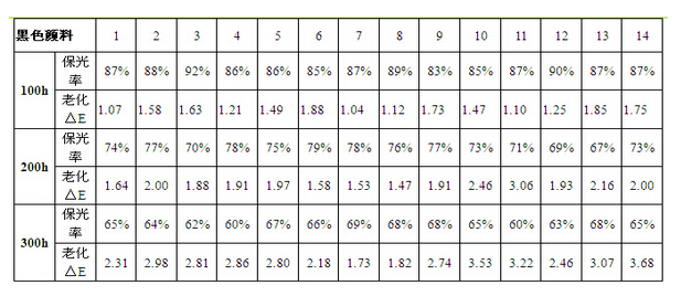 將200℃/10min涂膜鋁板放入老化箱,分別測其100h、200h、300h時的色差及光澤并計算出保光率。1-14號黑色顏料的耐老化性能如表1所示。