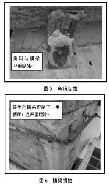 受某中級人民法院委托,對A 工程進行施工質量鑒定。A 工程位于福建南部地區,共有三棟大樓,均為五層建筑物。外裝飾含玻璃幕墻、鋁塑板幕墻、鋁合金窗分項。上述外裝飾工程于2008 年完工,但未經相關部門驗收。經檢查發現,部分耐候膠硬化、開裂,如圖1;鋁塑板面板嚴重褪色、發白,如圖2;部分鋁塑板面板四角處未設置角連件,未設置邊肋,僅設置1 根中肋,且嚴重銹蝕,如圖3;部分鋁塑板打膠面嚴重臟污,造成耐候膠脫膠,如圖4;橫梁與主體結構之間采用角碼連接,部分橫梁與角碼嚴重腐蝕,如圖5;部分轉角處未設置立柱,圖中橫梁僅剩下一半截面,且嚴重腐蝕,如圖6。該工程存在嚴重安全隱患。