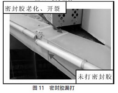 B 工程位于福建北部地區,大廈外裝飾為隱框玻璃幕墻和鋁單板幕墻,于2004 年竣工,至今已使用近10 年。檢查發現,有一處隱框玻璃幕墻處的后置錨固件(詞條“錨固件”由行業大百科提供)中有1 根錨栓漏錨、1 根錨栓傾斜、錨板與梁面未緊密接觸,有10mm左右間隙;此外,角碼與錨板的連接采用螺紋鋼過渡焊接,焊縫長度及位置不符合設計要求,如圖7、8,存在嚴重安全隱患。部分開啟扇執手(詞條“執手”由行業大百科提供)斷裂、開啟扇密封膠條已老化(詞條“老化”由行業大百科提供),如圖9、10,存在安全隱患。檢查發現鋁單板幕墻處,部分面板之間的接縫密封膠漏打,如圖11,導致幕墻漏水,造成錨板銹蝕。