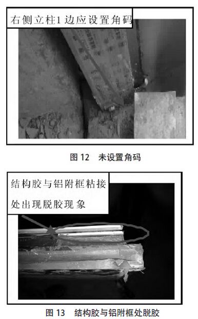 C 工程位于福建南部地區,外裝飾結構形式采用橫明豎隱玻璃幕墻、氟碳噴涂鋁單板金屬幕墻以及點支撐玻璃幕墻(詞條“點支撐玻璃幕墻”由行業大百科提供),幕墻總高度為100.9m,幕墻裝修面積約為13000m2,其中半隱框玻璃幕墻約為6050m2,點支撐玻璃幕墻約為145m2,鋁單板幕墻約為6805m2,根據業主委托,只對玻璃幕墻進行安全性鑒定。檢查發現,用于玻璃與鋁附框(詞條“附框”由行業大百科提供)粘接的結構膠已老化,結構膠最大拉伸強度時伸長率為71%;邵氏硬度為71;21 層抽樣處,立柱與主體結構連接只設置了右側角碼,左側未設置角碼,見圖12;4 層會議室處,用于玻璃與鋁附框粘接的結構膠沿鋁附框長邊方向出現150mm左右的脫膠,見圖13;10 層抽樣檢查位置處,用于玻璃與鋁附框粘接的結構膠沿玻璃長邊方向出現300mm左右的脫膠,如圖14,且結構膠已老化,結構膠最大拉伸強度時伸長率為51%,邵氏硬度(詞條“硬度”由行業大百科提供)為69;點支撐玻璃幕墻多處拉桿松動,有1 處拉桿連接銷軸向外脫出,如圖15,存在安全隱患。另外,除點支撐玻璃幕墻外的其它鑒定單元的玻璃面板(詞條“玻璃面板”由行業大百科提供)均采用外側為鋼化玻璃、內側為普通浮法玻璃的中空玻璃,不符合發改運行[2003]2116號文《建筑安全玻璃管理規定》中第六條必須使用安全玻璃的規定。