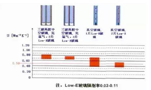 中空玻璃產(chǎn)品應(yīng)用比較早,技術(shù)上也相對(duì)成熟,高端產(chǎn)品一般通過選用優(yōu)質(zhì)Low-E并增加Low-E層數(shù),加厚中空層厚度和充氬氣等方式降低U值。
