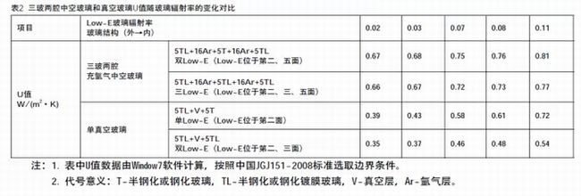從表2和圖2可見,當(dāng)Low-E玻璃輻射率為0.02-0.11時(shí),三玻兩腔中空玻璃頂級(jí)配置(充16mm氬氣,采用三片Low-E玻璃)的傳熱系數(shù)U值為0.66-0.77 W/(m2·K)。而真空玻璃則通過基本的配置(采用1片Low-E),U值就可以低至0.39W/(m2·K),使用兩片Low-E的真空玻璃U值可以低至0.35W/(m2·K)。