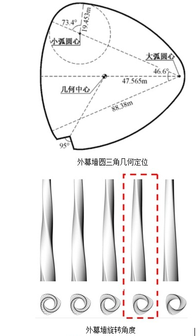 上海中心主樓的幾何外形在隨高度上升的過程中圍繞塔樓的幾何中心,同時(shí)發(fā)生旋轉(zhuǎn)和收縮兩種變化。對(duì)于構(gòu)成主樓旋轉(zhuǎn)表皮的幾何元素,設(shè)計(jì)中從工程學(xué)和美學(xué)雙向角度,進(jìn)行了反復(fù)論證優(yōu)化。