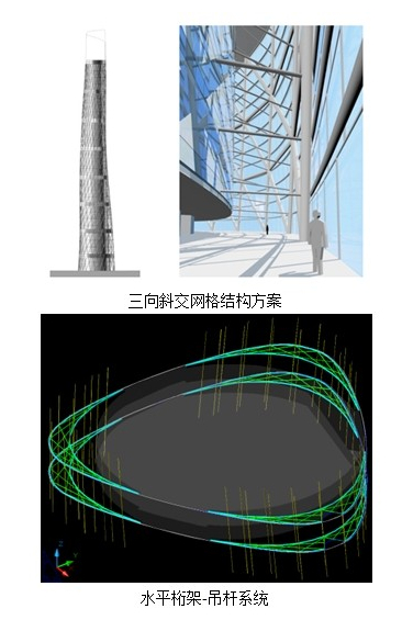 如何實(shí)現(xiàn)上海中心扭轉(zhuǎn)收縮上升的外立面幕墻是整個(gè)塔樓結(jié)構(gòu)設(shè)計(jì)的一個(gè)關(guān)鍵, 該幕墻突出的特點(diǎn)是幾何造型非常不規(guī)則且與主體結(jié)構(gòu)規(guī)則的幾何形態(tài)不匹配,幕墻遠(yuǎn)離主體結(jié)構(gòu),同時(shí)對(duì)幕墻的視覺效果要求很高,在幕墻支撐體系的比選階段,曾提出了剛性三向網(wǎng)格支撐結(jié)構(gòu)方案及水平桁架-吊桿方案。三向網(wǎng)格支撐結(jié)構(gòu)方案的優(yōu)點(diǎn)是結(jié)構(gòu)變形小,施工難度較低,但是,該方案對(duì)建筑外立面影響較大,結(jié)構(gòu)用鋼量大。水平桁架-吊桿方案,豎向采用吊桿,視覺通透性較好,但水平向桿件較多,嚴(yán)重影響中庭視覺效果。