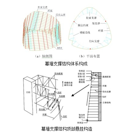 基于幕墻通透輕盈的要求,最終采用了分區(qū)懸掛的柔性幕墻支撐結(jié)構(gòu)體系,該體系可有效地協(xié)調(diào)外幕墻不規(guī)則的幾何形態(tài)和規(guī)則主體結(jié)構(gòu)間的幾何關(guān)系,同時(shí)相對(duì)主體結(jié)構(gòu)能在一定程度上自由變形,從而減小結(jié)構(gòu)構(gòu)件內(nèi)力,優(yōu)化構(gòu)件截面與形式。各區(qū)幕墻支撐體系均為獨(dú)立的基本單元,并且采用相同的,由“吊桿-環(huán)梁-徑向支撐”組成的柔性懸掛式幕墻支撐結(jié)構(gòu)體系。
