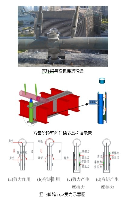 (1)底環(huán)梁豎向伸縮節(jié)點(diǎn):該構(gòu)造主要吸收變形量較大的主體結(jié)構(gòu)的設(shè)備層變形、主體結(jié)構(gòu)的壓縮變形、風(fēng)荷載等引起的兩個(gè)設(shè)備層間相對(duì)豎向變形以及吊桿伸長(zhǎng)變形,防止底層板塊系統(tǒng)受到擠壓而破壞。