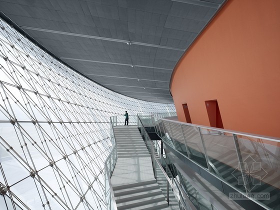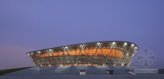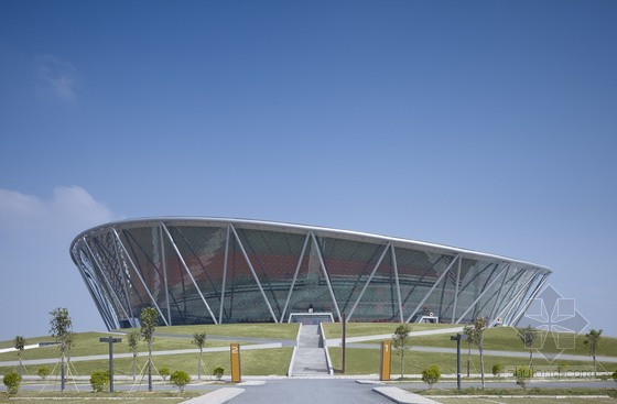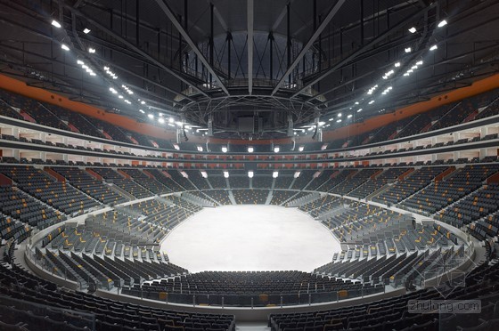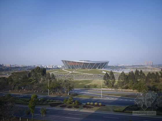 體育館在舉行體育賽事或重大活動時可提供15000個座席,同時也將成為成績優秀的東莞烈豹俱樂部隊的主場。體育館豐富多樣的設計手法再現了籃球運動的幾個元素:建筑主體位于一座抬高的基座上,屋面環狀流線令人聯想到籃筐的邊緣,網狀的立面系于其下。賽場主體外墻顏色采用籃球所有的典型橙色,在網狀幕墻結構之后格外鮮明,另外賽場內部也使用了橙色進行裝點。放射狀的屋面直徑157米,為一個外置呈波浪狀的壓力環。其上懸掛了28根鋼柱,對屋面的桁架結構起到穩定加固的作用。屋面坐落于之字型鋼柱之上。體育館外立面為世界范圍內首次使用的三向網格曲面索網幕墻體系,并以中空安全玻璃封閉。體育館為一個大型公園所環抱,是喧鬧的大街到體育館之間的緩沖地帶。公園綠地的規劃采用了與體育場造型的元素。寬闊的綠化帶、水邊蜿蜒的小徑圍繞著體育館四周,提供了理想的室外運動休閑場地。