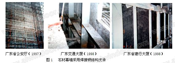 1996~1998年間,筆者參與了廣州的廣東省公安廳、廣東省交通大廈、廣東省建設銀行大廈幕墻工程,其石材幕墻部分均采用了焊接鋼結構(圖1)。至今已經十多年過去,中間還經歷了多次強臺風的考驗,使用情況一直良好。