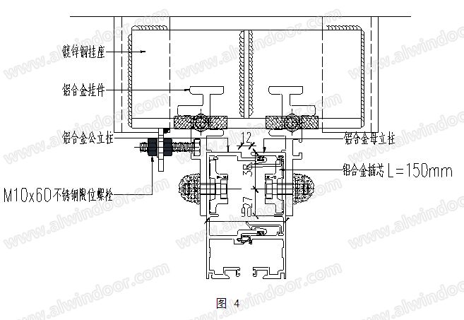 鋁合金掛鉤通過三顆螺栓固定在立柱上,并在固定部位的立柱內(nèi)側(cè)加設(shè)加強(qiáng)插芯,開口型材系統(tǒng)只需在板塊外側(cè)上螺絲即可,閉口型材系統(tǒng)需要在螺栓部位的板塊外側(cè)開工藝孔,在固定完畢后將工藝孔加密封膠帽,并打膠(詞條“打膠”由行業(yè)大百科提供)固定密封。