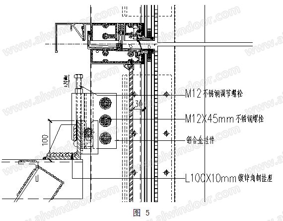 鋁合金掛鉤為鋁擠壓型材,為了滿足大型板塊的受力要求,在掛鉤處采用了延長接觸面措施,同時加長了掛鉤的前端截面,保證板塊受力安全。限位裝置通過在掛鉤側(cè)部設(shè)計(jì)螺母槽,利用不銹鋼螺栓進(jìn)行板塊單側(cè)鎖緊,既限制了左右水平移動,也限制了上下垂直移動,而且這種固定方式非常穩(wěn)固,即使在地震作用下也不會失效,比以往很多項(xiàng)目所用的螺釘頭限位法實(shí)用很多。掛鉤的上下調(diào)節(jié)用的是幕墻慣常的螺栓調(diào)節(jié)方式,即在掛鉤截面處開螺紋孔,再擰入螺栓調(diào)節(jié)。(如圖 4,圖5)