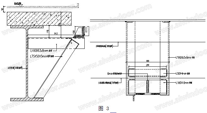 該項(xiàng)目沒有在鋼梁預(yù)置(詞條“預(yù)置”由行業(yè)大百科提供)支座肋板,所有的支座都需要現(xiàn)場焊接。因此設(shè)計(jì)師設(shè)計(jì)了一種結(jié)構(gòu)簡單,焊接量相對少,對主體變形影響最小的做法。在水平梁側(cè)布置雙三角撐,并把它們水平連接起來。把單元幕墻的掛接底座直接焊接在雙三角撐的最前端。這種結(jié)構(gòu)有效分散了支座反力(詞條“支座反力”由行業(yè)大百科提供),減輕結(jié)構(gòu)自重,減少焊接量,對結(jié)構(gòu)梁的影響最小。(如圖 3)