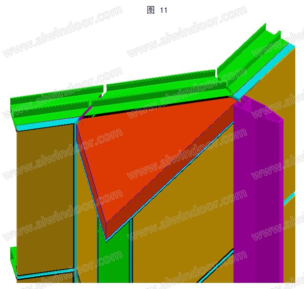 該項目的外立面退臺非常小,小到可以完全由一個單元板塊去容納,實現(xiàn)上也相對比較簡單,處理難點是含退臺的單元板塊上橫梁需通常蓋住立柱,固定方式采用角鋁固定。(如圖 11)轉(zhuǎn)折位置的上橫梁會出現(xiàn)一個過渡三角位置(如圖12),此部位應(yīng)該屬于旁邊的單元板塊,固定方式采用角鋁固定,所有上橫梁的斷開部位均用EPDM膠皮覆蓋密封。