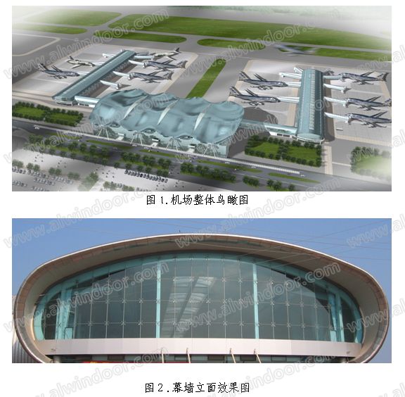 新建的重慶江北國際機(jī)場位于重慶市渝北區(qū)兩路鎮(zhèn),建筑面積8萬余平方米,由航站樓主樓、連廊、指廊三部分組成(如圖1)。主樓為混凝土框架結(jié)構(gòu),三層,標(biāo)高7.5米以上為大跨度無柱空間鋼結(jié)構(gòu)支撐的金屬屋面;連廊與指廊二層,一層為混凝土框架結(jié)構(gòu),二層以上為圓弧形鋼結(jié)構(gòu)支撐屋面,建筑幕墻面積約53000平方米,由索結(jié)構(gòu)點(diǎn)式玻璃幕墻、開放背栓式石材幕墻、鋁板幕墻、鋁合金玻璃幕墻、扣條式蜂窩鋁板幕墻、全玻幕墻等組成。其中在航站樓左右兩側(cè)四個(gè)指廊端頭采用了豎向單層索網(wǎng)點(diǎn)支式玻璃幕墻, 幕墻面積約1500平方米,是國內(nèi)第一個(gè)圓弧形幕墻采用單層索網(wǎng)結(jié)構(gòu)作為支撐體系的工程項(xiàng)目。